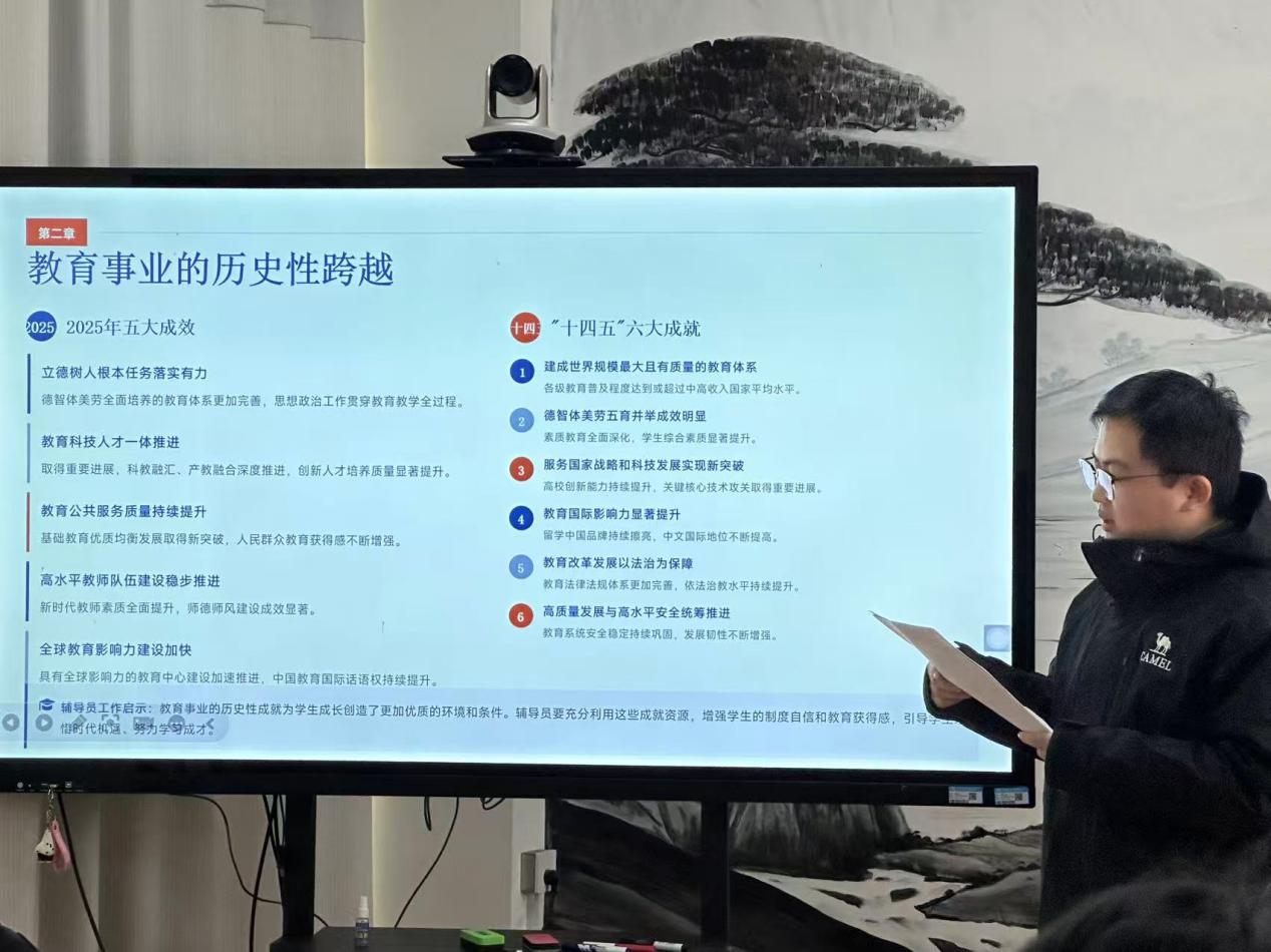 为深入贯彻2026年全国教育工作会议核心精神,推动教育强国建设要求落地基层育人一线,2026年1月18日,现代服务与经贸学院开展第6期辅导员思享会。本次会议由王圣老师主讲,全体辅导员齐聚一堂,围绕“会议精神解读+学院工作融合”展开深度研讨。